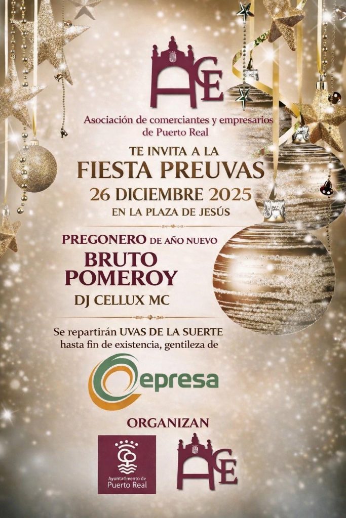 La Asociación de Comerciantes y Empresarios de Puerto Real (ACE Puerto Real) organiza un año más la Fiesta Preuvas, que tendrá lugar este viernes 26 de diciembre en la Plaza de Jesús a partir de las 21:00 horas.