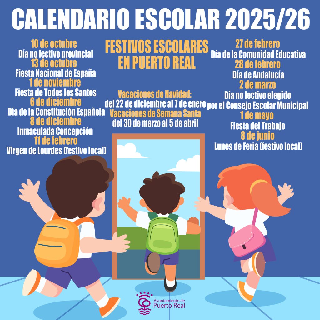 El Consejo Escolar Municipal de Puerto Real ha aprobado el calendario escolar para el curso 2025-2026, incorporando los festivos locales y el día no lectivo municipal a los ya establecidos por la Delegación Territorial en Cádiz de la Consejería de Desarrollo Educativo y Formación Profesional, y la Consejería de Universidad, Investigación e Innovación.