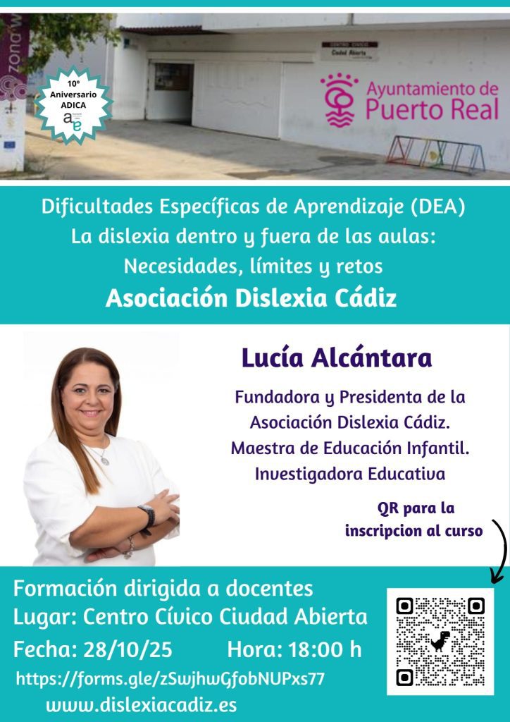 Asimismo, teniendo en cuenta la importancia de la información y la formación, se ofrecerá la charla “Dificultades específicas de aprendizaje: la dislexia dentro y fuera de las aulas: necesidades, límites y retos”, por parte de Lucía Alcántara, fundadora y presidenta de ADICA e investigadora educativa. Aunque esta formación esta dirigida a docentes, está abierta a la participación de la ciudadanía en general.