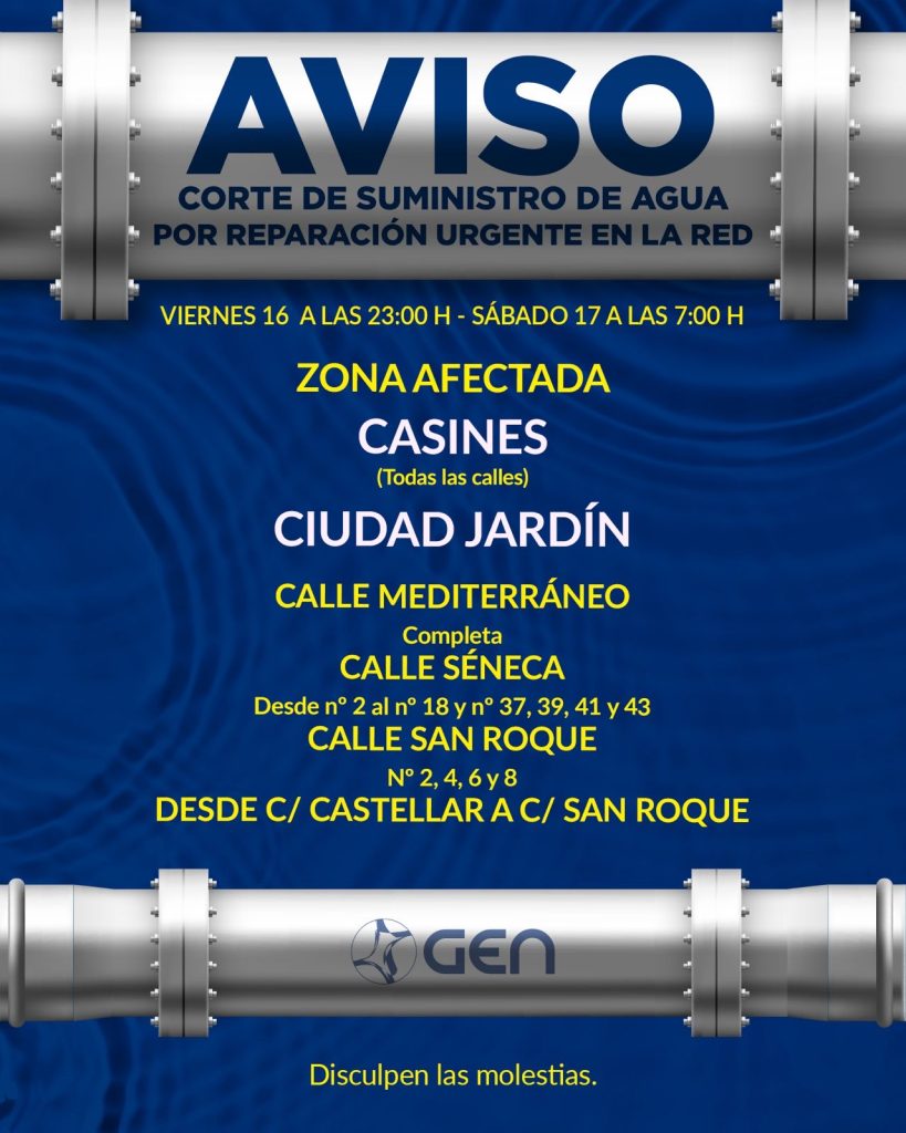 ATENCIÓN: Corte de suministro de agua por obras urgentes en la red, desde el viernes 16 de enero a las 23:00 h hasta el sábado 17 a las 7:00 h.