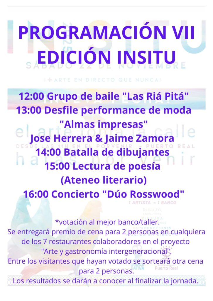 En esta edición IN SITU contará con la actuación del grupo de baile “Ria pitá” (12:00h), el desfile performance de moda conceptual y reivindicativa “Almas impresas” de José Herrera y Jaime Zamora (13:00h), una batalla de dibujantes (14:00h), la lectura de poemas a cargo del Ateneo Literario de Puerto Real (15:00h) y música en directo con el “Dúo Rosswood” (16:00h). Además, habrá un espacio reivindicativo dedicado a la Guerra de Palestina porque, “IN SITU no solo es un día festivo y alegre sino también para reivindicar”, tal y como comentaba el presidente de la entidad organizadora.