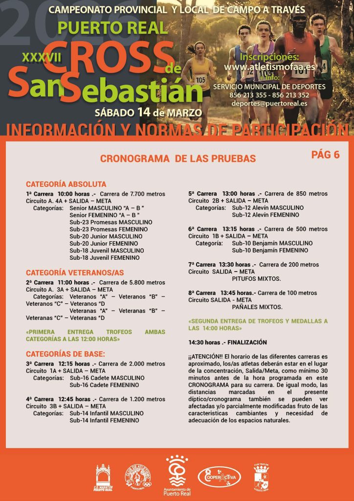 El deporte vuelve a ser protagonista en Puerto Real con la celebración del XXXVII Cross de San Sebastián, una de las pruebas más tradicionales del municipio, que tendrá lugar el 14 de marzo a partir de las 10:00 horas. Podrán participar todos los atletas que lo deseen, siempre que se ajusten a las edades y categorías marcadas por la organización. Las inscripciones deberán realizarse exclusivamente online a través de la plataforma oficial de la Federación Andaluza de Atletismo: www.atletismofaa.es hasta el 12 de marzo (fecha límite para formalizar la participación).