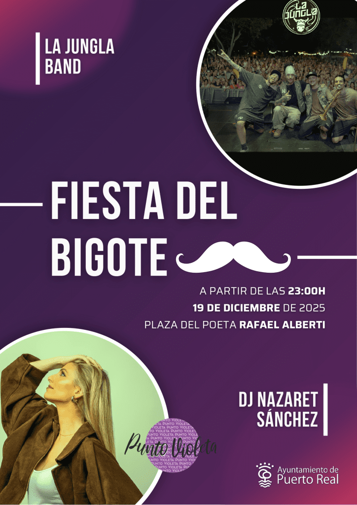 El Ayuntamiento de Puerto Real invita a toda la ciudadanía a disfrutar de la Fiesta del Bigote, que se celebrará el próximo viernes 19 de diciembre de 2025, a partir de las 23:00 horas, en la Plaza Poeta Rafael Alberti, en el Paseo Marítimo.