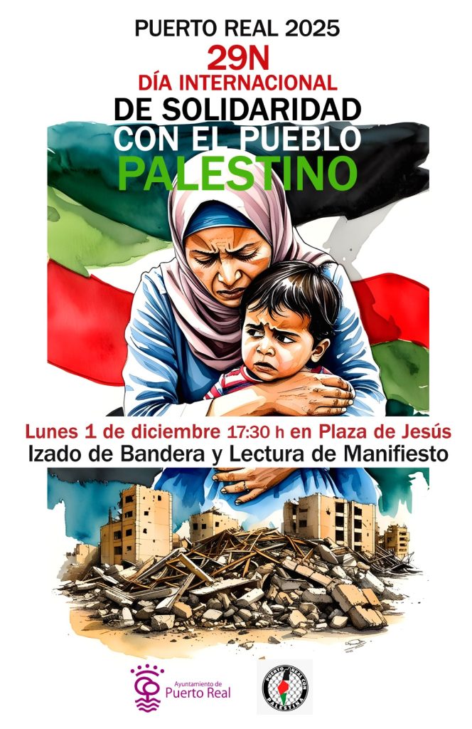 Con motivo del Día Internacional de Solidaridad con el Pueblo Palestino que se conmemora el 29 de noviembre, el Ayuntamiento de Puerto Real celebrará un acto el próximo lunes 1 de diciembre, a las 17:30 horas, en la Plaza de Jesús en colaboración con la Plataforma Puerto Real con Palestina.