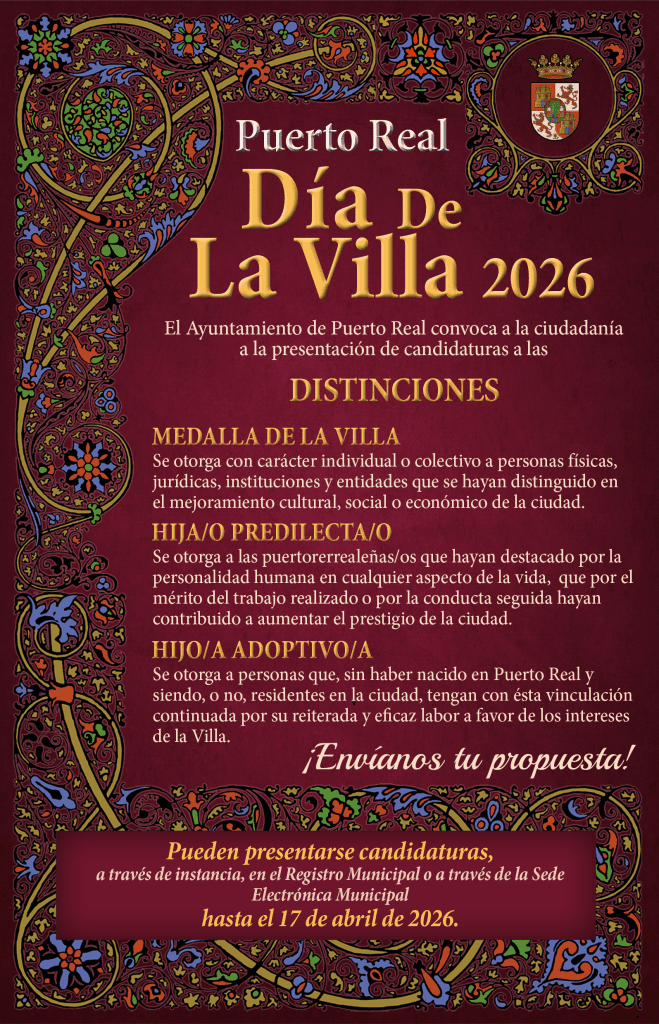 El Ayuntamiento de Puerto Real recuerda a las personas interesadas que hasta el 17 de abril podrán presentar candidaturas a las distinciones honoríficas del Día de la Villa 2026, un reconocimiento anual con el que la ciudad homenajea a personas, colectivos e instituciones que han contribuido de manera destacada al desarrollo y bienestar del municipio.