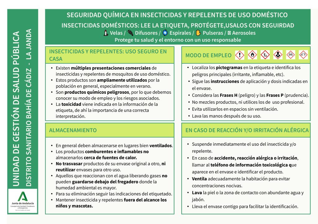La Junta de Andalucía está promoviendo mensajes oficiales de salud pública —a través de distritos sanitarios y ayuntamientos— dirigidos a la población para fomentar el uso responsable, seguro y eficaz de insecticidas y repelentes en hogares.